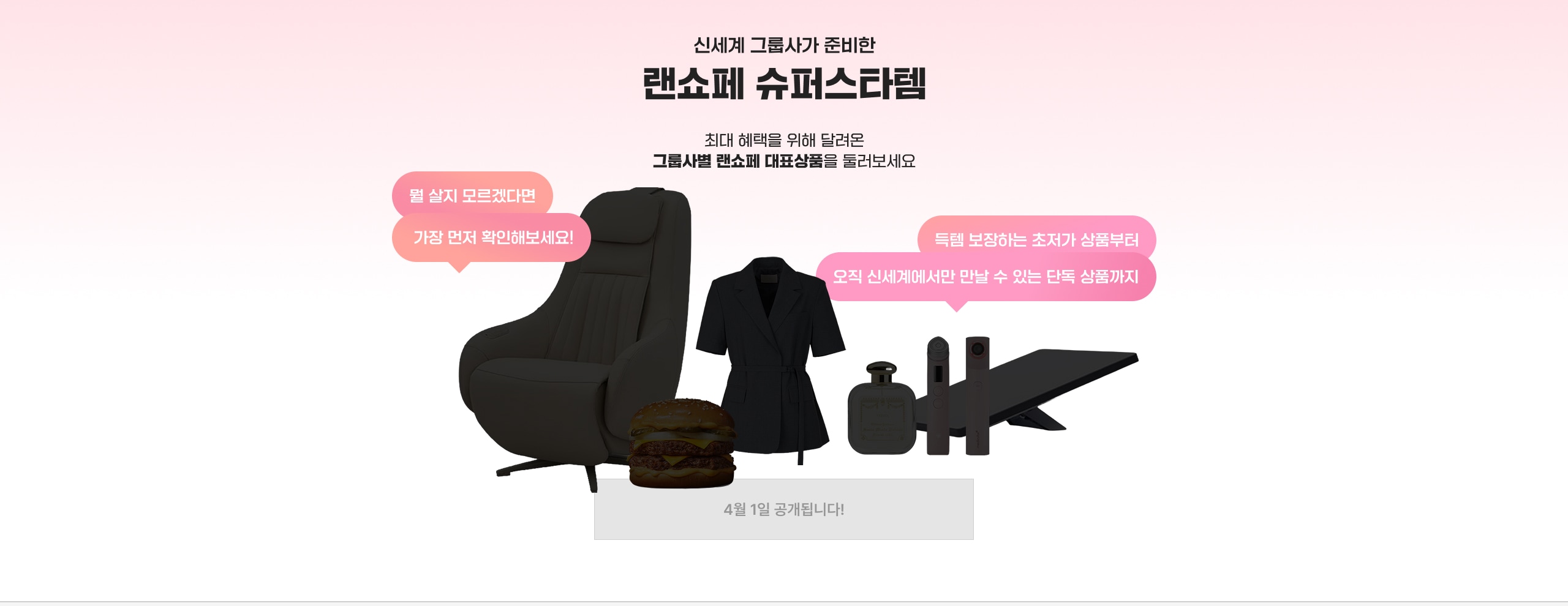 신세계 그룹사가 준비한 랜쇼페 슈퍼스타템 최대 혜택을 위해 달려온 그룹사별 랜쇼페 대표상품을 둘러보세요 득템 보장하는 초저가 상품부터 오직 신세계에서만 만날 수 있는 단독 상품까지 뭘 살지 모르겠다면 가장 먼저 확인해보세요! 4월 1일 공개됩니다!
