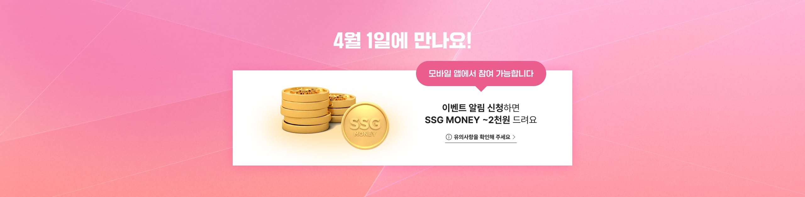 4월 1일에 만나요! 모바일 앱에서 참여 가능합니다 이벤트 알림 신청하면 SSG MONEY ~2천원 드려요