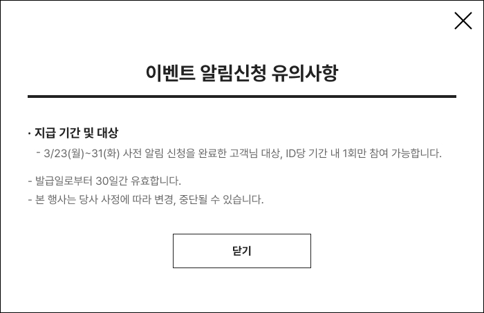 - 3/23(월)~31(화) 사전 알림 신청을 완료한 고객님 대상, ID당 기간 내 1회만 참여 가능합니다.