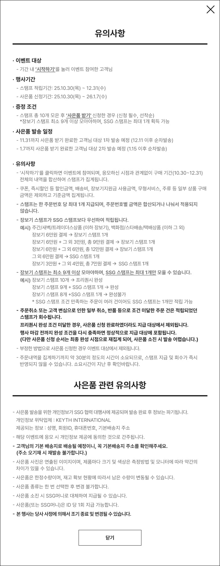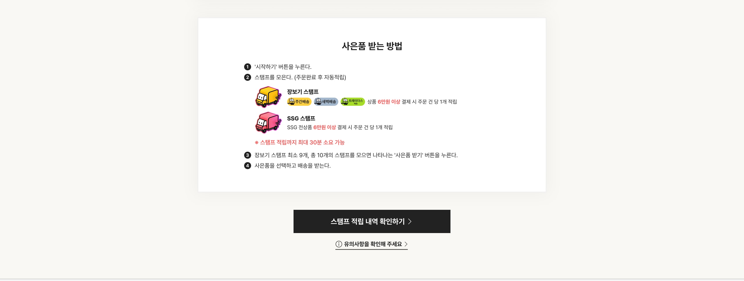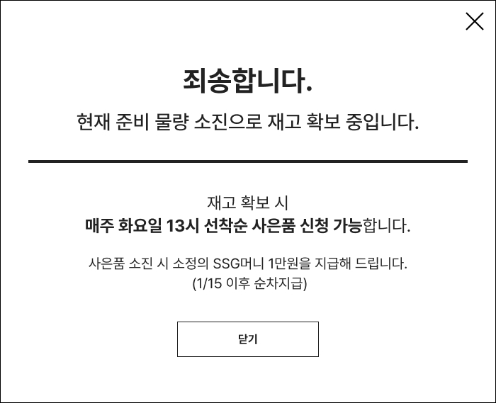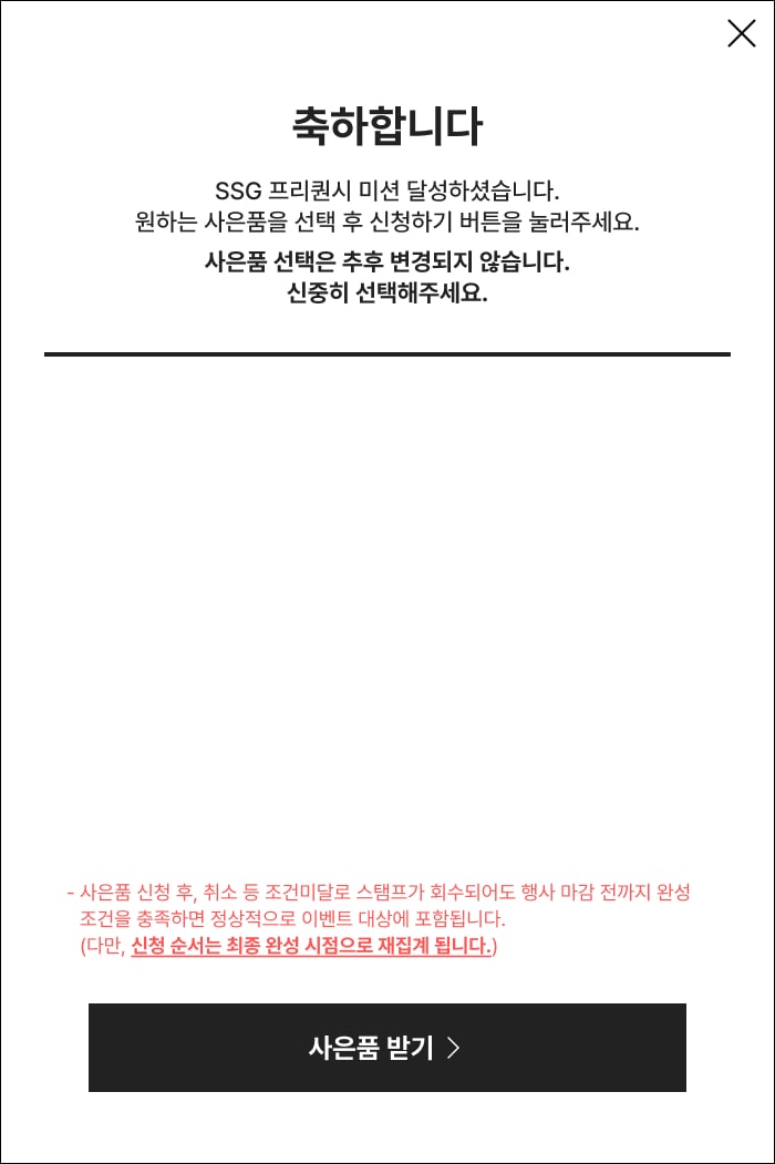 사은품 전량 소진 신청 완료한 고객님께 사은품 발송, 프리퀀시 완료 후 사은품 미신청한 고객님께는 소정의 SSG MONEY 1만원 지급해드립니다. (1/15 이후 순차발송)